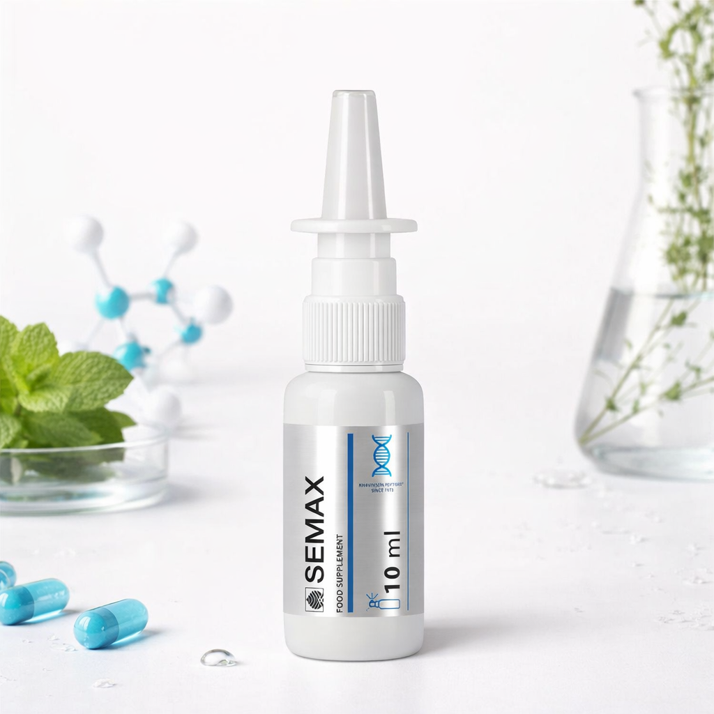 Semax (Семакс) — сучасний ноотропний пептид, що сприяє покращенню пам’яті, концентрації та розумової працездатності. Діє на рівні центральної нервової системи, підтримуючи роботу мозку, знижуючи рівень стресу та підвищуючи ясність мислення. Назальний формат забезпечує швидкий ефект і зручність застосування без ін’єкцій.
